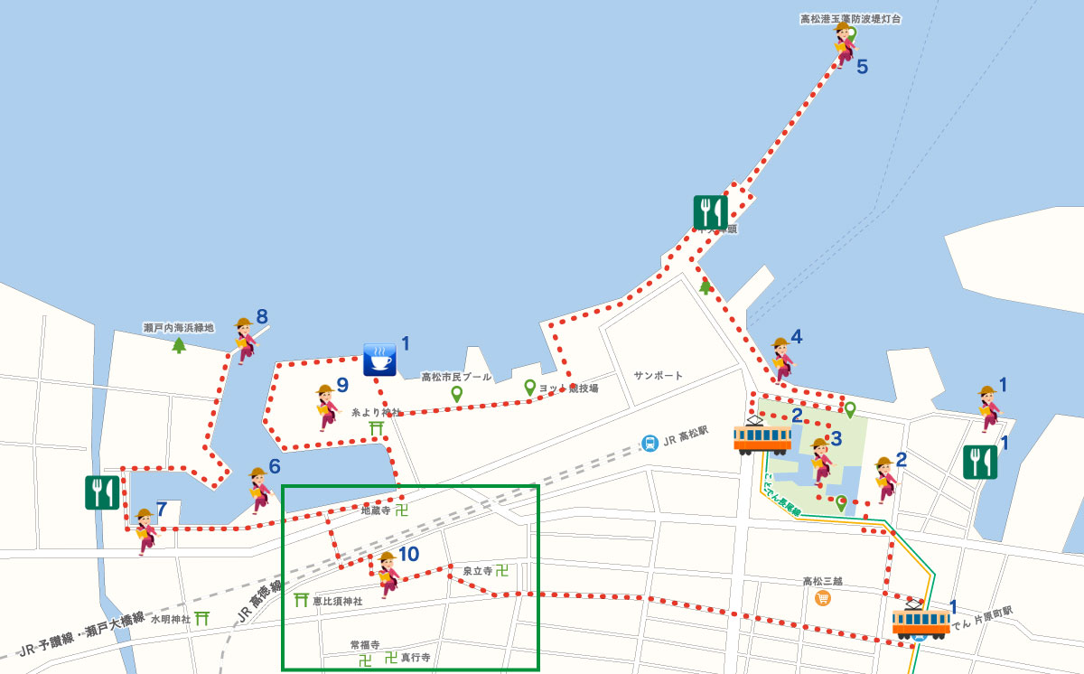 “Walking Around Takamatsu Port and Nishihama Fishing Port” is a sample plan, which corresponds to No. 4 in “Walking Around Takamatsu” of “Places to Go”. The map shows you how to get there from the apartment, a walking route, interesting spots, scenic points, and restaurants and coffee shops along the route.